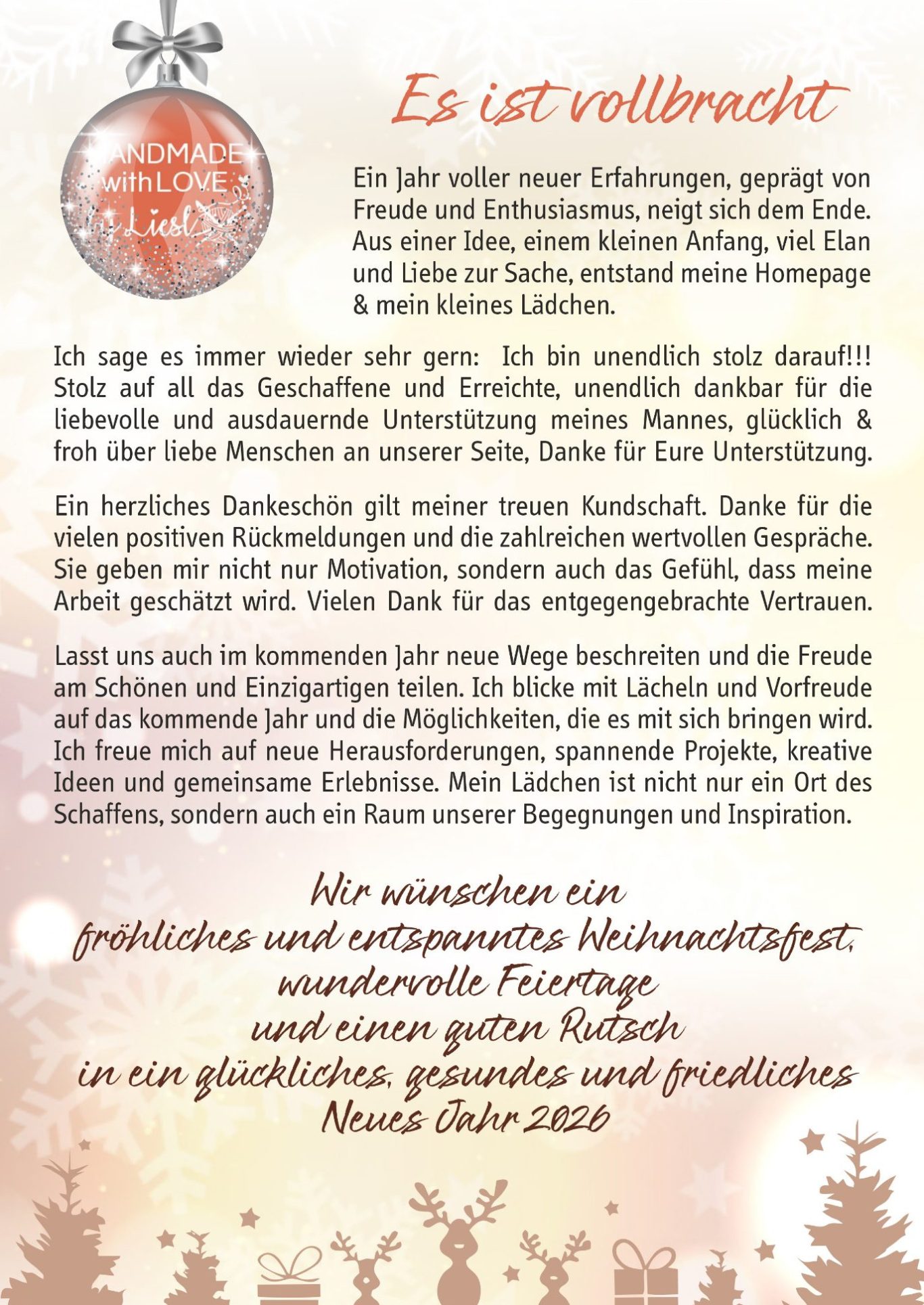 Mögen die Feiertage Ihnen Ruhe, Freude und unvergessliche Momente schenken. Ich danke für Ihre Treue und freue mich auf ein weiteres erfolgreiches Jahr mit Ihnen.